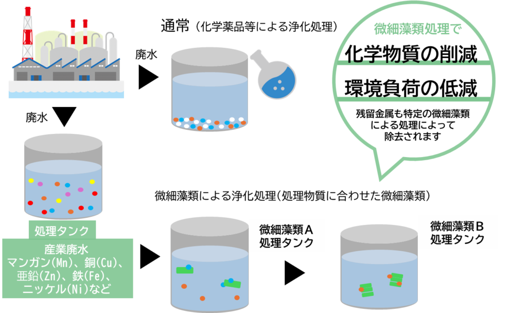 処理物質に合わせた微細藻類を選択することにより、環境へ負荷を減らすことも可能です。
