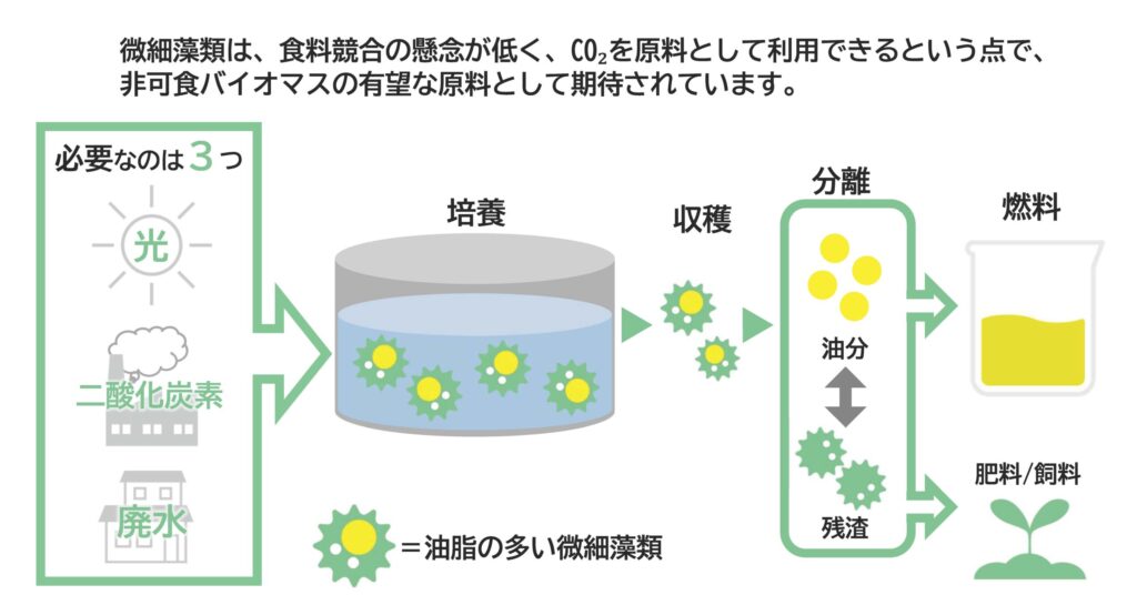 工場の排ガス(CO₂)を培養装置に導入することで、微細藻類が光合成によりCO₂を直接固定化し、自らのバイオマスへと変換します。