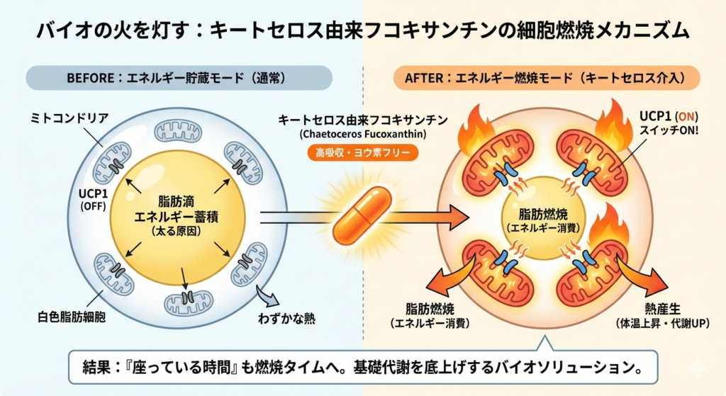 私たちが提案するフコキサンチンは、単なる栄養素ではありません。細胞内のミトコンドリアに存在する「UCP1(脱共役タンパク質1)」を活性化させるスイッチです。通常、運動によってのみ発動するこの燃焼スイッチを、分子レベルでONにすることが研究によって示唆されています。